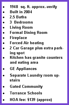 A very special property in gated complex “IMPRESSIONS”. It was built in 2004. This is a ’better than new’ Detached Townhome (Patio Home). This unit has many upgrades including custom tile floor in the kitchen / eating area. Granite kitchen with a built-in wine cooler in the center island. Custom paint. Some windows have custom drapes, some have plantation shutters. This property has a wonderful back yard patio. It includes a bonus outdoor kitchen, which has a Bar-B-Q, refrigerator and granite counter. Two car private garage with extra built-in storage shelves. PLUS an additional parking spot. This home has it all and Torrance Schools! MLS # P915504